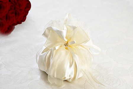 Poseta mireasa realizata din satin si decorata cu panglici de organza si cristale.