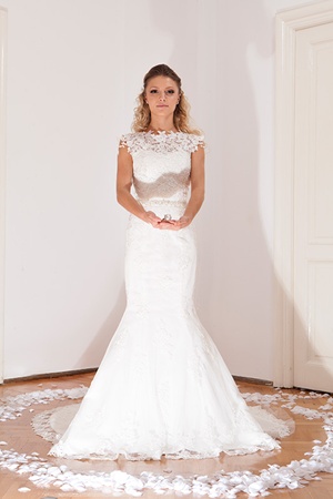 Rochie de mireasa stil sirena decorata cu decupaje florale din dantela si cu o centura din perle si cristale.