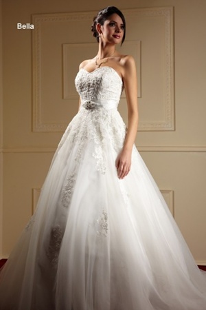 Bella este o rochie in linie "A" cu talie ridicata, realizata din dantela si tulle brodat cu insertii de cristale Swarovski. Talia este conturata de o pamblica ce se continua pe trena.