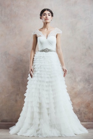 Cu o fusta usoara din volane de tulle inspirata de traditia spaniola, cu talia marcata de o decoratie in stil vintage, cu umerii invaluiti senzual intr-un abur de dantela rochia de mireasa Camila te va transforma intr-o gratioasa printesa spaniola.